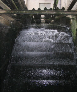 Das Wasser trifft auf das Mühlrad, dass eine Breite von 1,60m und einen Durchmesser von 7,0m hat. Durch die Drehung des Rades wird Energie erzeugt. Die entstehende Kraft entspricht 40 Pferdestärken (PS).